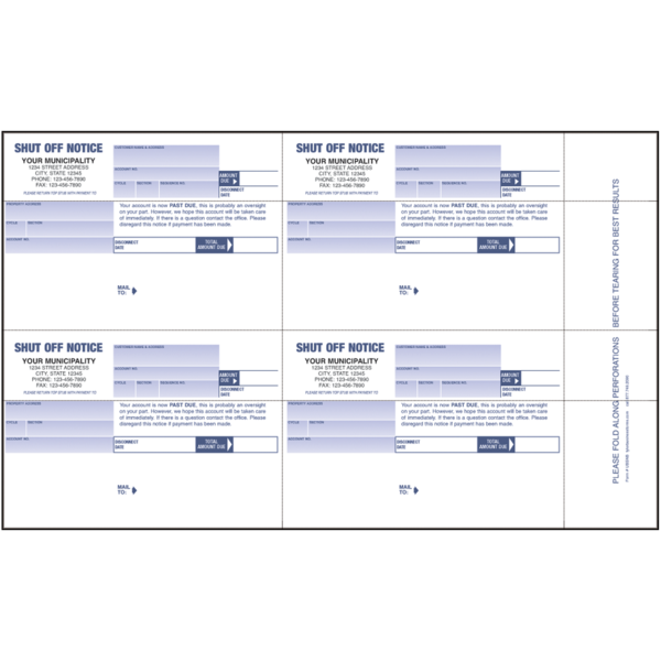 UBSNB Shut Off Notice SKU: UBSNB $1.08 Select options Back $1.08 REPEAT, NEW, OR REPEAT WITH CHANGES ? : Repeat New Repeat With Changes Prior Job# Special Instructions COLOR: Company Information Line 1 Company Information Line 2 Company Information Line 3 Company Information Line 4 Company Information Line 5 City State Zip Phone Fax Email SELECT LOGO COLOR : Black Reflex Blue Process Blue Teal (PMS 320) Green (PMS 348) Green (PMS 347) Brown (PMS 464) Maroon (PMS 201) Burgundy (PMS 208) Warm Red Red (PMS 185) Orange (PMS 151) Gray (PMS 423) Custom Color Logo & Options : $0 - Color Logo $68 - Black Logo $90 - Color Logo No Charge - 1 Color Logo No Charge - Black Logo Quantity -+ Please select options before adding to cart Add to Cart Add to Cart